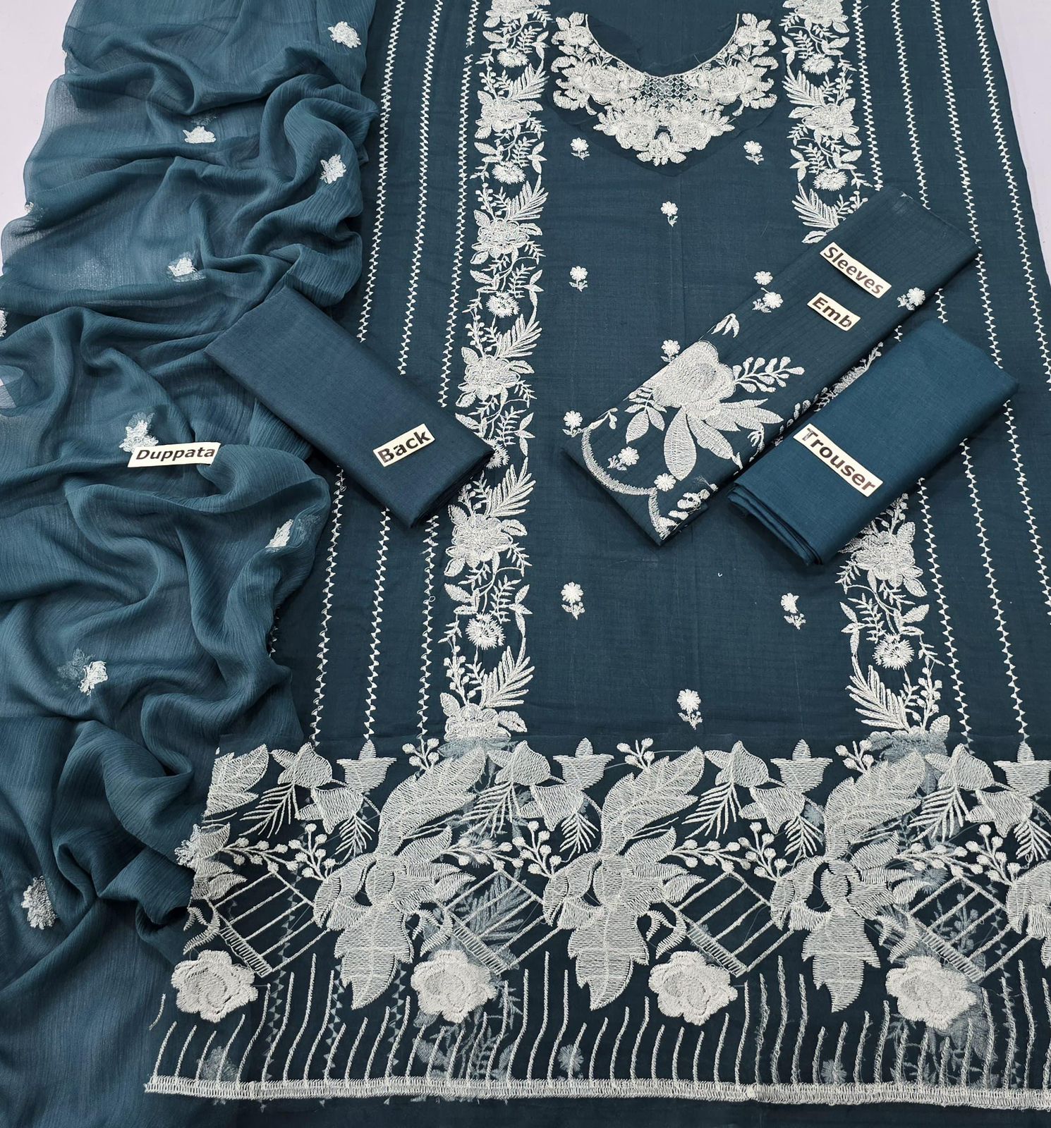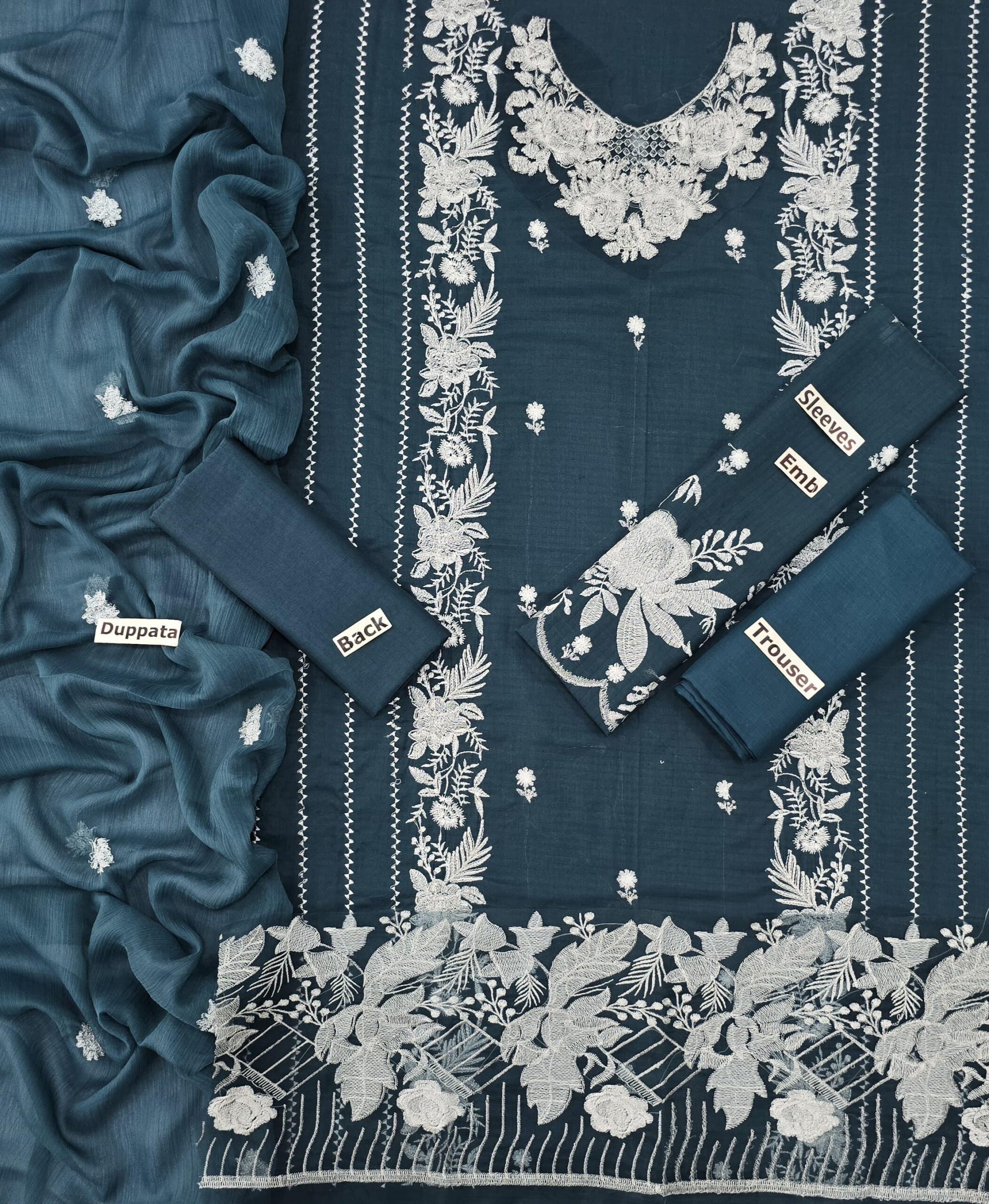 Front: Embroidered Lawn front with embroidered neck & daman patch, & full embroidered sleeves