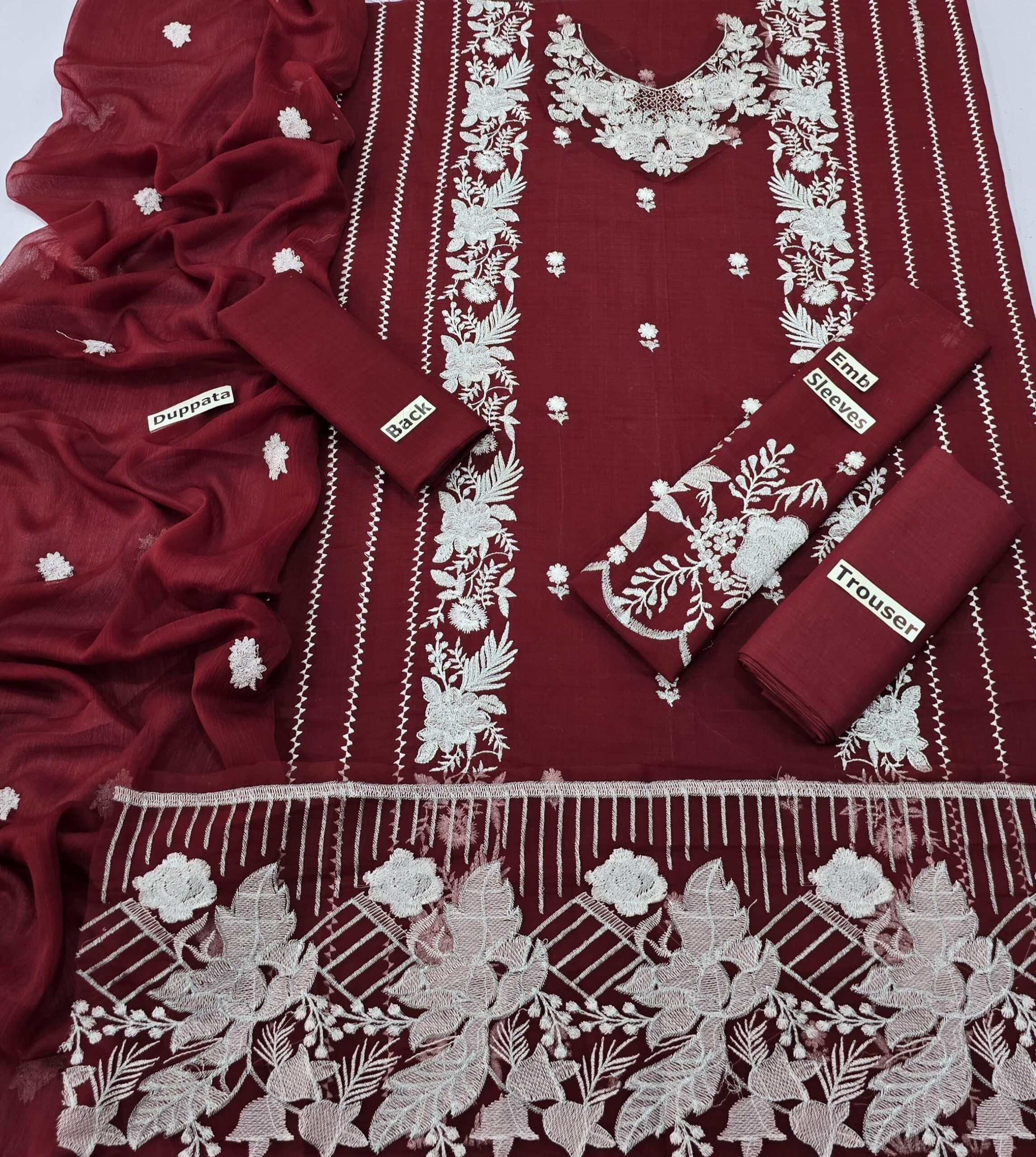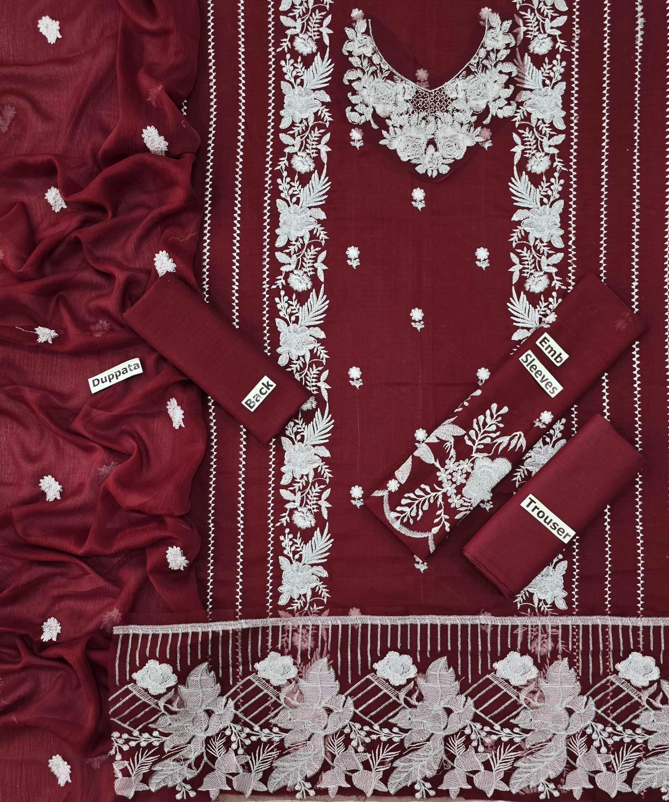 Front: Embroidered Lawn front with embroidered neck & daman patch, & full embroidered sleeves